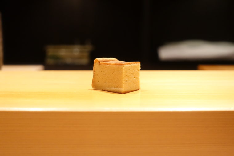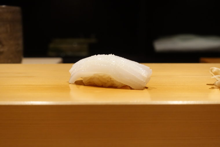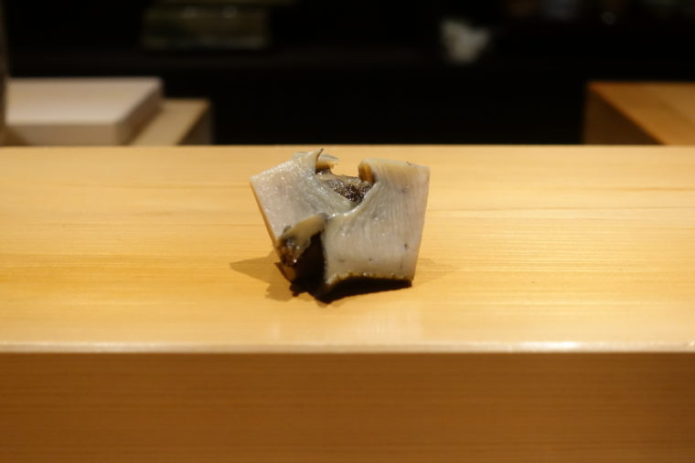 最初に出るのは、握りの前の二皿。「蒸し鮑(茨城)」は、柔らかさの中にしっかりとした歯切れ。塩と肝の苦味が味を締め、香りがすっと抜ける。素材の持ち味だけで構成された一皿。