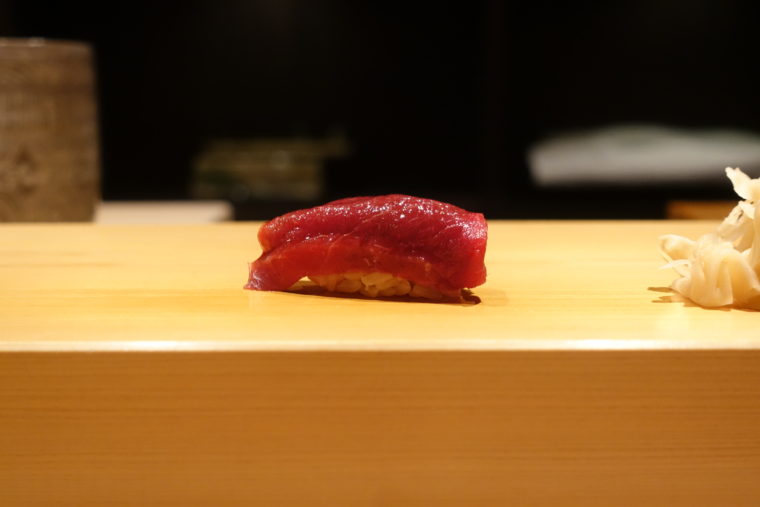 続く「漬け」はユニークな三つの角切り。厚みの中に漬け地の香りが薄く残り、噛むたびに赤身の鉄分が立ち上がる。握りへの流れをつくるための一手。