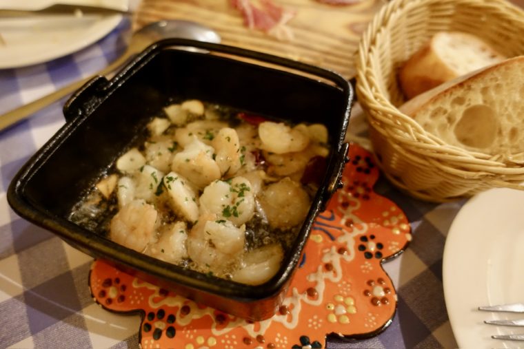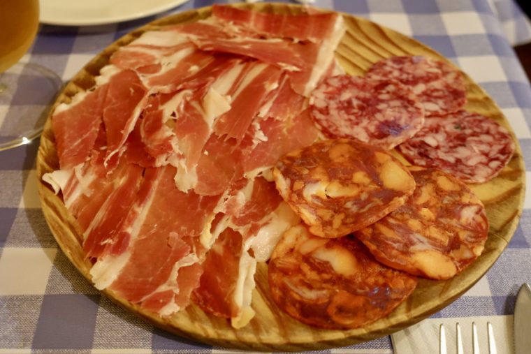 2025.10.24 夜 スペインを知らない自分が、スペインを思い出す。@エル・カステリャーノ 世界料理(ヨーロッパ) 原宿・表参道・青山 5000円〜9999円 ★★★☆☆ 渋谷・宮益坂を少し上がった先、赤と黄のスペイン国旗が目印の『エル・カステリャーノ』。1977年創業、渋谷の街で半世紀近く続く老舗のスペイン料理店だ。店名の「カステリャーノ」とは“カスティーリャ語=標準スペイン語”の意味。その名が示す通り、王道ど真ん中のスペイン家庭料理を貫いてきた場所。 最初の皿は「生ハム&サルチチョン&チョリソ」。それぞれの個性は控えめながら、きちんと塩気でまとまっている。生ハムは脂が舌の上で静かに溶け、サルチチョンは肉の旨味が素直に広がる。チョリソ程よいスパイス感、アルコールと相性がいい。バルの最初の一皿としてはちょうどいい塩梅。赤ワインをゆっくり傾けながら味わうのが似合う。 続いて「スペインオムレツ」。見た目は素朴、味も想像通り。でも、その想像を裏切らないところに安心感がある。厚みのある卵の中にじゃがいもが詰まり、しっとりとした食感が続く。油は少し強めで、後半に重たさも感じるが、それもまた家庭の味の範疇。飾らない温かさがある。 「たらのコロッケ」は小ぶりで食べやすく、外はカリッと、中はふわっと。たらの塩味にアイオリのにんにくが重なり、シンプルながらもパンチがある。ただ、油の余韻がやや長く、好みは分かれそう。ハーフサイズで頼めるのがありがたい。 「小海老のアヒージョ」は定番中の定番。にんにくとオリーブオイルの香りが心地よく、海老の旨味が染み出したオイルが主役。パンを浸して食べると止まらない。少し塩が強めではあるが、ワインのあてとしてはむしろ丁度いい。 そして「イカ墨パエリア」。黒い米の上に赤ピーマンといんげん、リング状のイカ。ビジュアルはクラシックそのもの。米は少し硬めで、鍋底にはしっかりとソカラットが残る。イカ墨のコクはありながらも、後味は意外に軽い。 全体的に、味わいはどれも堅実で、奇をてらわない構成。いわゆる街のスペイン食堂として完成している。料理は手堅く、空間は温かい。そういう意味で、まさに本場のバルに来たような体験ができる場所。行ったことないけど。 ご馳走様でした。 — エル・カステリャーノ050-5456-1815東京都渋谷区渋谷2-9-12 インテリックス青山通ビル 2Fhttps://tabelog.com/tokyo/A1303/A130301/13001313/