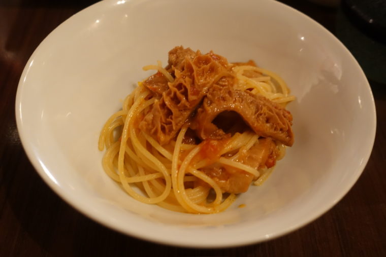 そして今夜、もうひとつ「トリッパのスパゲッティ」。煮込みの定番をパスタとして再構築した一皿。蜂の巣の食感とトマトの酸味、パルミジャーノの香りが幾重にも重なり、噛むほどに旨味が増す。煮込みの力強さを持ちながら、後味は驚くほど軽い。重さではなく、旨味の余韻だけを残すのが馬場流。