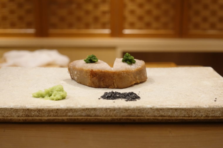 2025.11.02 夜 骨太な鮨、銀座にて@鮨 冨味 寿司 銀座・新橋・有楽町 10000円〜29999円 ★★★☆☆ 銀座の片隅、控えめな灯りに浮かぶ『鮨 冨味』の看板。店内は白木のカウンターに静かな照明、所作も穏やか。だがその雰囲気とは裏腹に、料理は全体的に“力強さ”を前面に押し出す。とにかくカットが厚い。シャリも赤酢をしっかり利かせており、輪郭の太い構成。まるで、大将のどっしりとした佇まいをそのまま形にしたような鮨だ。 つまみはやはり全体的にボリュームがあり、どれも一皿の主張が強い。 「真鯛と蕪のみぞれ餡」お椀代わりの温前菜。鯛の旨味に蕪の甘みを合わせる素直な構成。優しいが、やや単調。 「八寸」河豚の唐揚げを中心に、銀杏、栗、むかごなど、季節の顔ぶれ。 「マハタの刺身」厚切りで噛み応え十分。竹炭塩が魚の輪郭を引き締める。 「つぶ貝」歯応えの後にミルキーな甘みが広がる。 「鰹」漬けにして厚みを出す。 「鰆の焼き物」皮の香りが立ち、身は柔らか。やはりサイズ感は堂々としたもの。 「焼き胡麻豆腐」香ばしい表面と滑らかな中身。 握りは赤酢のシャリがはっきりと主張し、切りつけの厚みと重なって輪郭のある味わいに。 「中トロ」石司の鮪。脂の質は良いが、厚みと温度が重なりやや鈍い。 「墨烏賊」包丁目が細かく、噛むほどに甘みが滲む。 「ノドグロ」脂の強さが厚みに比例する。 「とろたく巻」鰹節の香りがアクセント。ボリュームのある巻物。 「小肌」酸の掛け算。 「赤貝」肉厚で香り高く、噛みごたえを楽しむタイプ。 「車海老」塩と柑橘で。シルエットも面白い。 「雲丹」竹炭塩で香りを添える。 「漬け」強めのづけ地で赤酢に合わせる直球勝負。 「穴子」ふっくらと煮上げ、煮詰めはやや甘め。 「玉子」…プリンのような柔らかさと甘さ。デザート感覚の一品。 全体として、“豪快で骨太”。厚みのある切りつけと赤酢のシャリで押し切る構成は、最後まで一貫して力強い。味の重なりにやや粗さは残るものの、その勢いがこの店の魅力なのかも。ご馳走様でした。 — 鮨 冨味050-5600-7849東京都中央区銀座8-7-19 すずりゅうビル 2Fhttps://tabelog.com/tokyo/A1301/A130101/13287552/