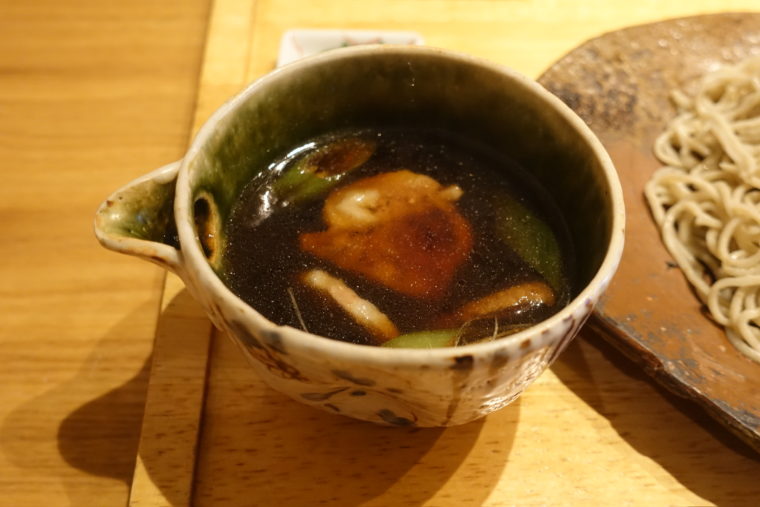 つゆは鴨の旨味を軸に、醤油の酸味が輪郭を整える設計。表面には鴨脂の薄膜が張り、蕎麦を潜らせるたびに艶が出る。焼きねぎの甘みが途中から合流し、香ばしさとコクが重なっていく。最初に鴨の香り、次に醤油のキレ、そして最後に脂の柔らかい余韻。