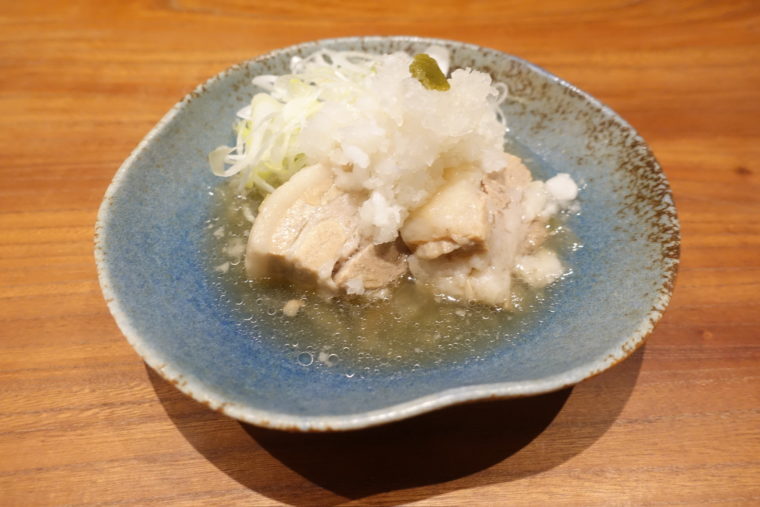 提供まで少し時間がかかるとのことで、逸品料理を先に。それが名物である「白い角煮」。しっとりとした肉質に驚くほど軽やかな脂、そこへおろしの清涼感とネギの歯ざわりが重なり、柚子胡椒がキレ良く全体をまとめる。角煮という名前を借りながら、まったく重たさのない、豚の旨みだけがすっと立ち上がる仕立て。待ち時間ですら、この店のこだわりを味わう時間に変えてしまう。
