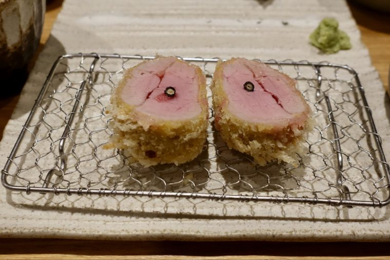 続くヒレは、贅豚(ZEITON)。こちらはロースとはまた違う衝撃がある。まず、とにかく柔らかい。歯を立てた瞬間にすっとほどけていき、赤身の旨みが静かに広がる。ヒレらしい軽さを残しつつ、薄い膜の向こう側にあるような繊細なコクがあって、気がつけばもう一切れ、と手が伸びてしまう。ロースの華やかさに対して、ヒレはしなやかで上品な余韻。