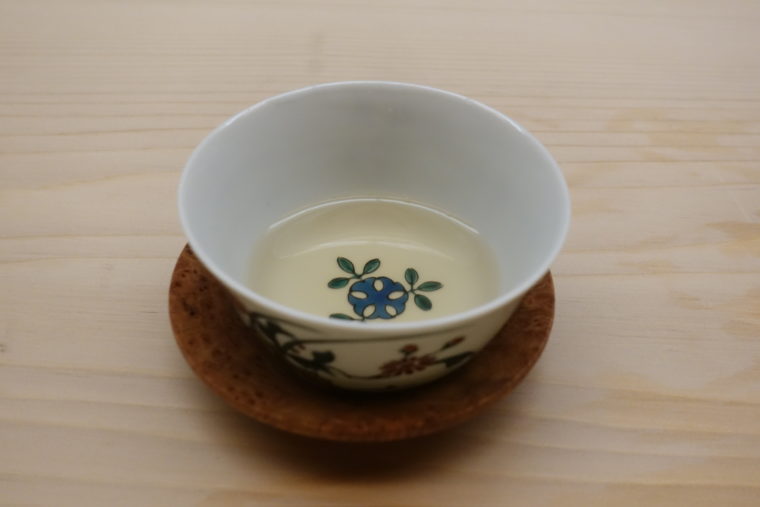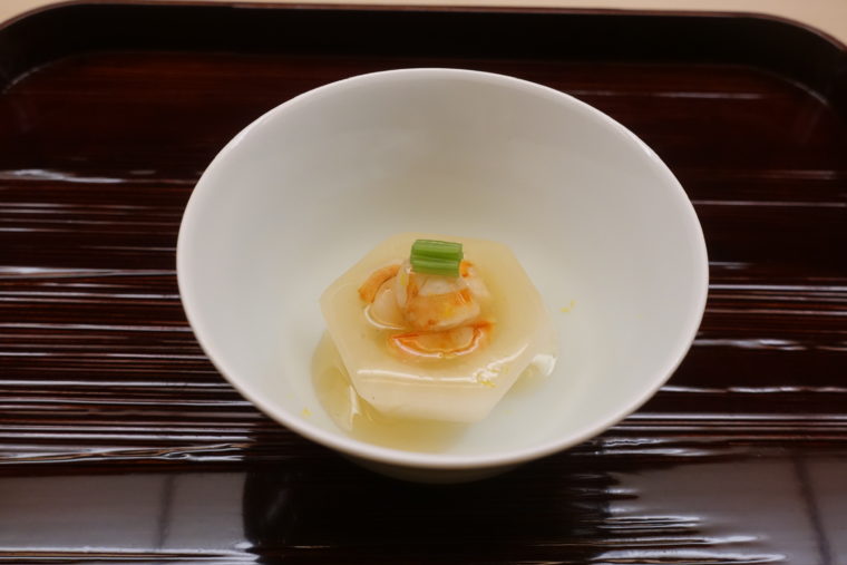 料理の始まりは「能登椎茸と能登の湧水のお香煎」。椀ではなく、まず、飲む出汁で森の香りを立ち上げてくるあたりがこの店らしいアプローチだ。澄んだ湧水に能登椎茸のうま味が静かに溶け込み、口の中が一気に北陸モードへと切り替わる。