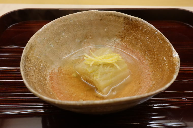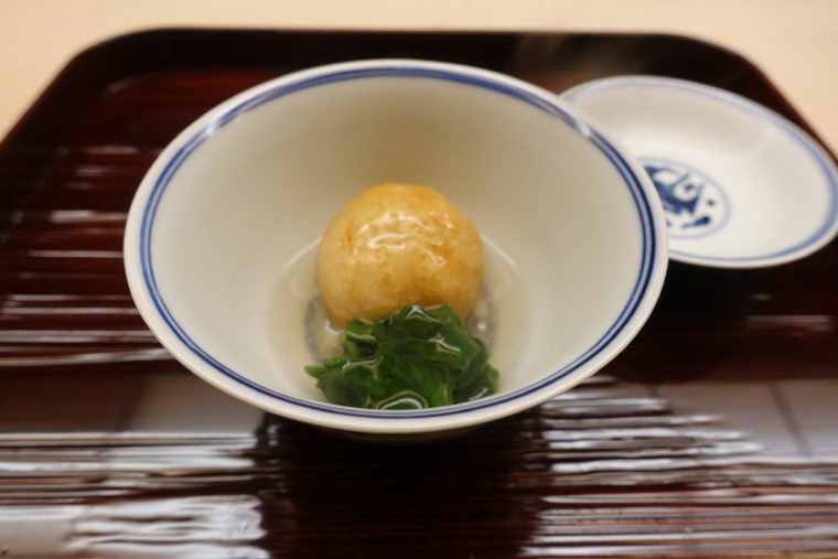 続く「里芋団子」は、加賀蓮根の節の部分を使った食感の良さが光り、噛んだ瞬間にほろりと崩れていく柔らかさの中に、旨味の芯がしっかりと残る。金沢春菊のほろ苦さが後味を引き締め、しみじみとうまい。