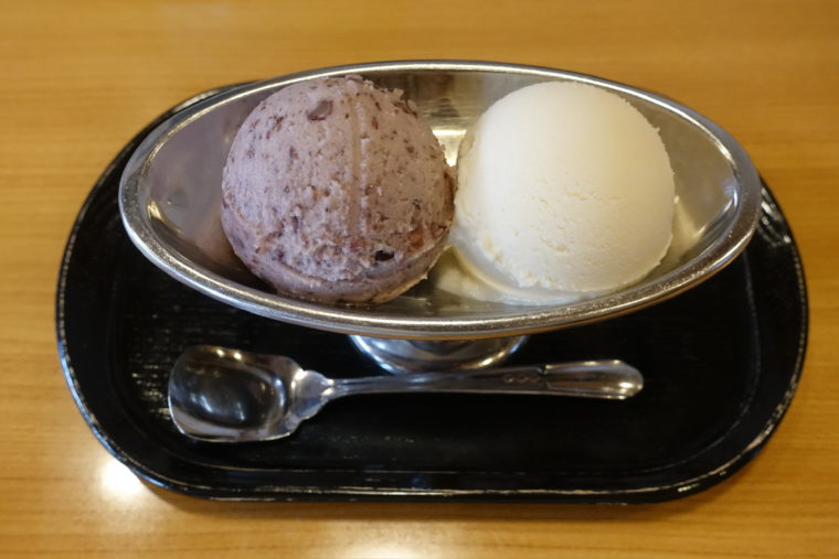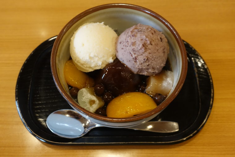 2025.11.20 昼 大正創業の面影を感じる、根津の甘味処@芋甚 デザート 上野・浅草・日暮里 〜999円 ★★★☆☆ 根津の街を歩いていると、ふと視界に入る木の看板と赤茶の暖簾。下町の空気にすっと溶け込むように佇むのが、1912年(大正元年)創業の甘味処『芋甚』だ。屋号からも連想できるとおり、はじめは焼き芋を中心とした商いだったが、関東大震災を境に甘味処へと舵を切り、火を使わず提供できる自家製アイスを軸にした現在のスタイルが育まれていったのだとか。 注文したのは「アベックアイス」と「アベックあんみつ」。 まず「アベックアイス」。銀皿に並ぶバニラと小倉の二球は、奇をてらわない古典の構えだが、ひと口でしっかり印象を残す。バニラはミルクの輪郭が柔らかく広がり、小倉は豆の粒を残した炊き具合で、香ばしさと甘さがきれいに寄り添う。 「アベックあんみつ」は、寒天の張り、黒蜜の深み、果物や求肥のやわらかい甘さが、控えめながらしっかり役割を果たしている。その上にバニラと小倉のアイスが乗ることで、全体の輪郭が締まり、甘味としての完成度が一段上がる。特に黒蜜と小倉が重なる瞬間は、長い年月で磨かれてきた組み合わせの説得力がある。 百年以上の歴史がある店だが、味わいはどこか軽やかで、今の気分にもすんなり寄り添う。根津の空気とともに静かに続いてきた甘味処で、またふっと思い出した頃に立ち寄りたくなる。そんな距離感がちょうどいい。ご馳走様でした。 — 芋甚03-3821-5530東京都文京区根津2-30-4https://tabelog.com/tokyo/A1311/A131106/13003559/