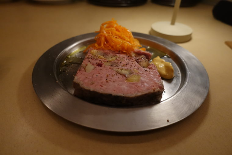 最初の一皿は「能登栗しっとりパテドカンパーニュ」。銀色のプレートに切り出されたパテは、断面に能登栗がごろりと顔を出し、視覚からして温度のある佇まい。ナイフで切るとほどよい抵抗があり、口に含めば肉の旨味が静かに広がり、栗の甘みが後ろから寄り添う。粗挽き胡椒がふっと香りを引き締め、キャロットラペの酸がいいリセットになる。こういう定番の皿が素直に美味しい店は、料理全体への信頼が自然と高まる。
