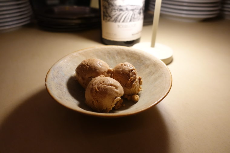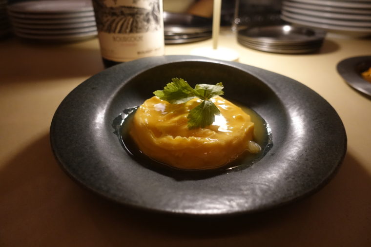 続く「レモンとバターのオムレツ」は、特別に出していただいた一皿。厚みのある卵の丘がソースに浸り、スプーンを入れると、半熟よりわずかに進んだ火入れのとろりとした質感が立ち上がる。バターのまろやかなコクが最初の合図を出し、すぐにレモンの酸が輪郭を整え、全体に軽やかな余韻を残す。卵料理の素直な美味しさをきちんと形にした印象だ。