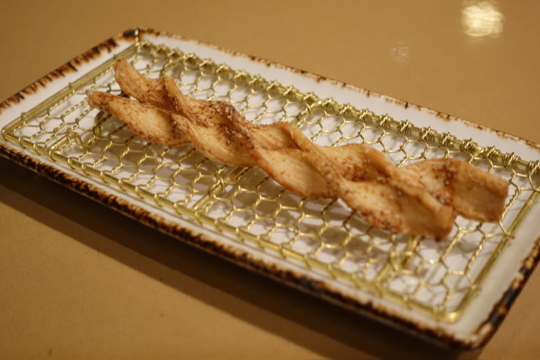 コースの始まりに供されるのが、香ばしいひと口サイズの「サクリスタン」。クロワッサン生地をねじって焼き上げた、フランス由来の伝統菓子。軽やかな食感と層のあるバターの香りに、塩とスパイスを効かせた味つけが施されており、その見た目にも心がほどける。