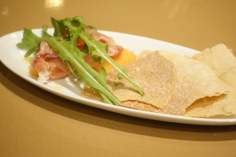 焼きピザ生地“スキアッチャータ”はサクッと香ばしく、生ハムと柿の甘さとのコントラストが楽しめる。