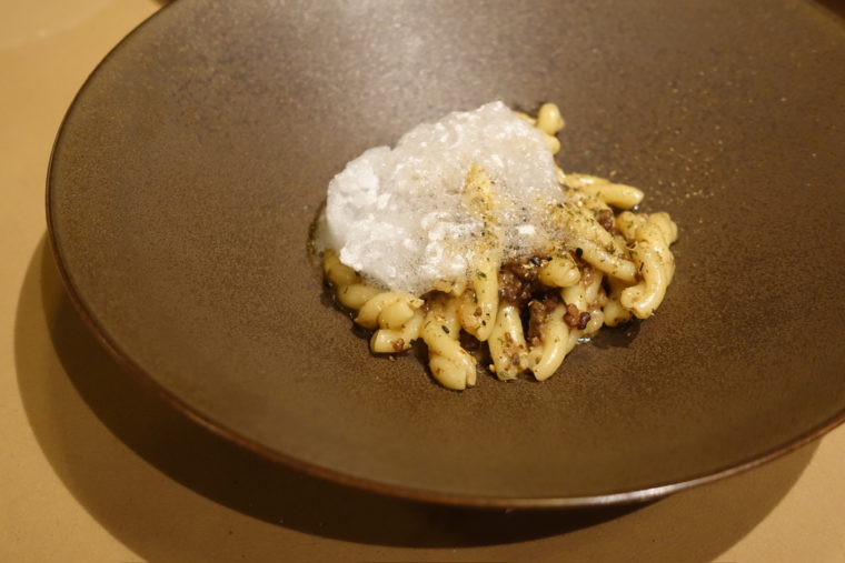 主役のパスタは「淡路製麺のカサレッチャ 塩ボロネーゼ ミックススパイス」。モチモチとしたショートパスタに、ミートソースの旨味と香辛料の複雑な余韻。そこへ乗せられた椎茸の泡が、まるで和の出汁のような奥行きをプラスする。