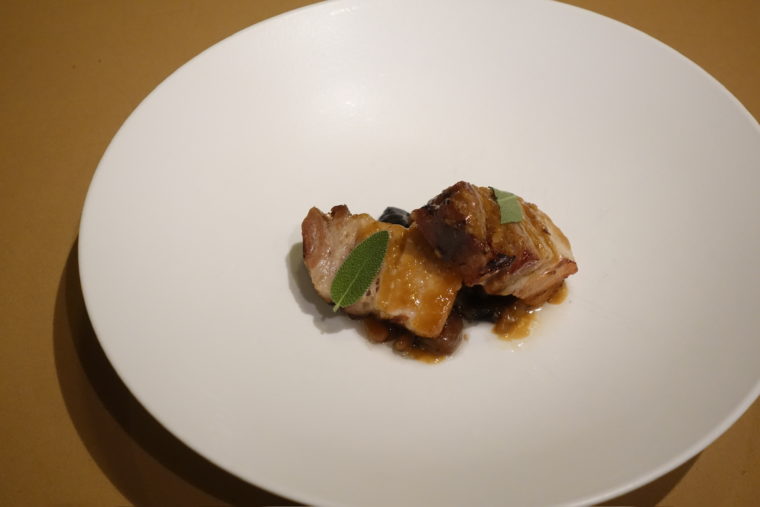 肉料理はどちらのコースでも共通で「豚ばら肉のグリル カポナータ 生姜香るシェリーヴィネガーのソース」。脂がとろけるようにジューシーなバラ肉に、甘く煮込まれたカポナータの野菜、そして生姜とシェリーヴィネガーの香りと酸味が絡み合う。じんわりと染み込む甘辛のニュアンスは、どこか高級生姜焼きを思わせる親しみやすさ。