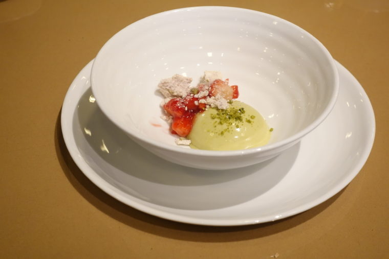 デザートは選択式。「ピスタチオと苺のパンナコッタ」は王道にして鉄板、なめらかなムースとクランチのコントラストが心地よい。