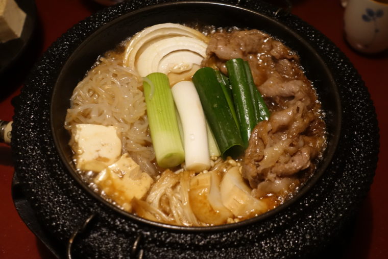 2026.01.03 夜 先斗町に残る、変わらないすき焼きのかたち@すきやき いろは 北店 焼肉・肉料理 京都市 10000円〜29999円 ★★★☆☆ 鴨川と木屋町に挟まれた細い通り、先斗町。京都らしい風情が色濃く残るその地に、明治44年(1911年)創業の『すきやき いろは』の歴史が息づく。大正期に先斗町へ移転し、昭和39年(1964年)に開かれた「北店」は、元お茶屋を改装した畳敷きの個室空間。喧騒を離れて、ゆっくりとすき焼きと向き合える環境が整っている。 看板の「すき焼き」は、鉄鍋にざらめを敷いて火にかけるところから始まる。店ではこの砂糖を「ごあん」と呼び、一般的な上白糖より粒が大きく、溶ける時間もゆっくり。その分、香ばしさがじっくりと立ち上がる。 頃合いを見て霜降りの和牛ロースを投入。軽く焼き色がついたところで、秘伝の割下を回しかける。肉に火が通りすぎないように仕上げるのはスタッフの手際に任せて、客はただ出来上がりを待つだけ。卵にくぐらせて口にすれば、脂の甘みと赤身の旨味が一体になって、素直に「うまい」と思える仕上がりだった。 野菜類は後から鍋に投入。豆腐、白滝、長葱、榎茸など、定番の構成ながら、それぞれの具材が鍋の旨味を吸って役割を果たしていた。葱は焼き目がついたことで甘みが引き立ち、白滝は食感のアクセントに。 ご飯と卵もセットで用意されており、肉をご飯にのせて頬張れば、自然と笑みがこぼれる。 口を整える前菜には「蛸と胡瓜の酢味噌和え」。 デザートは粉糖を軽くまとった苺。酸味と冷たさが、食後の満足感をそのままに、気持ちを落ち着かせてくれる。 先斗町の賑わいの中にありながら、『いろは 北店』の空間は静かで落ち着いている。格子戸を抜けて個室に入れば、外の喧騒が嘘のよう。観光地にありながら、慌ただしさとは無縁で、すき焼きと向き合うための余白がしっかりとある。奇をてらわず、丁寧に整えられた料理と、老舗らしい安定感のあるもてなし。京都の奥行きを静かに感じさせてくれる、そんな一軒だった。ご馳走様です。 — すきやき いろは 北店075-221-0403京都府京都市中京区先斗町四条上ル鍋屋町215https://tabelog.com/kyoto/A2601/A260201/26002605/