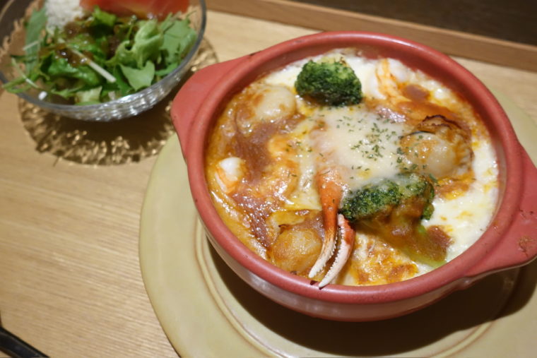 「シーフードドリア」は、トマトとホワイトの2種ソースに、エビ、ホタテ、カニ爪などを合わせた構成。具材のボリュームは十分で、味つけもクセのない方向。軽食としては悪くないが、記憶に残るほどの仕掛けはない。