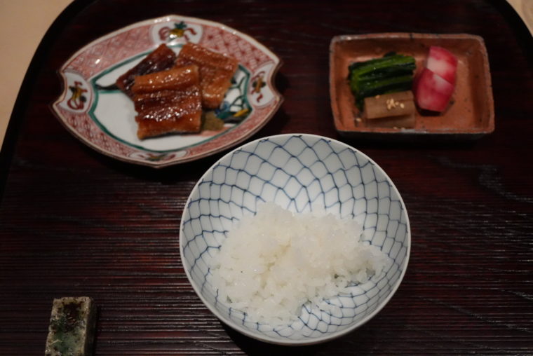 そして締めの「食事」。まずは蒲焼の鰻を白飯で。しっかりとした照りと、米の粒立ちの良さが際立つ。
