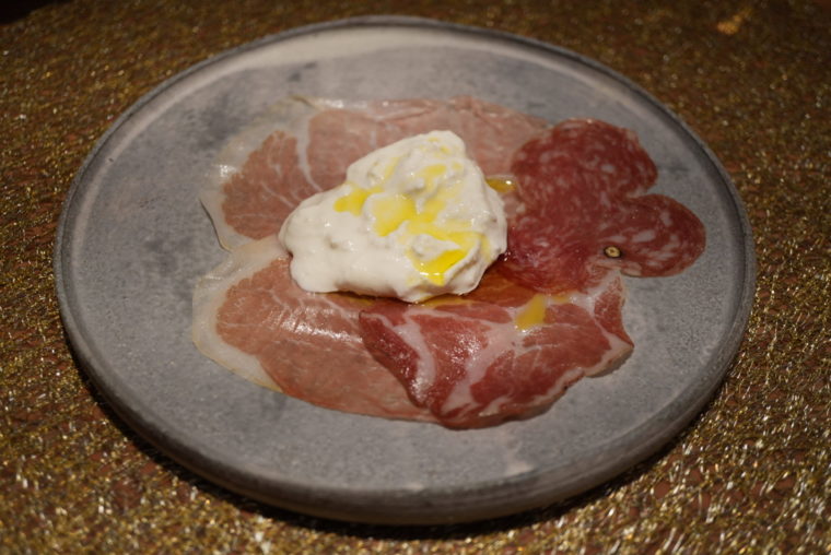 「生ハムとサラミとブッラータ」は、八ヶ岳のクリスタルポークによる自家製生ハム、フランス産のコッパ、イタリア産のブッラータ。熟成の香り、塩気、脂の甘みのバランスが良い。
