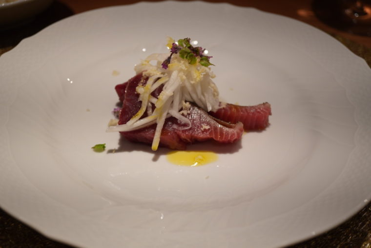 「ヤイトガツオのカルパッチョ」は、長野産の無農薬蕪、糸島レモン、赤ワインビネガー、十勝の山わさびを合わせたサラダ仕立て。厚めのカツオの赤身に、酸味と辛味のコントラストが加わり、しっかりした素材感がきちんと整理されて届く。