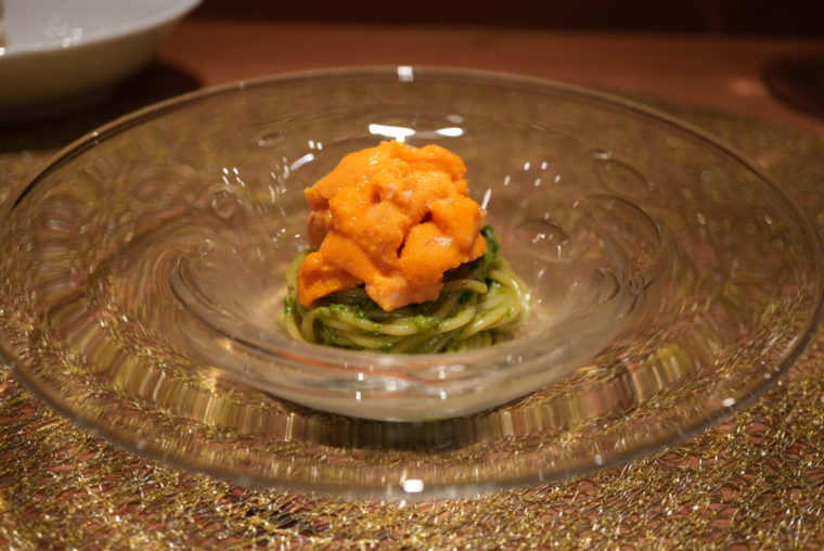 「ウニのジェノベーゼ」は、同店のコンセプトを象徴するような一皿。すり鉢で松の実、にんにく、バジルを丁寧にあたってソースを立ち上げる。その時点で、バジルの香りがカウンター中に立ち込めるほど強く、空間ごと持っていかれる。当然、口の中ではなおさら。粗めに刻まれたバジルが余計に香りを引き立て、そこにたっぷりのウニが重なる。磯の甘さ、青さ、オイルの艶やかさが一体となり、香りで食わせる料理に仕上がっている。作りたてだからこそ成立する温度と香りの重なり。