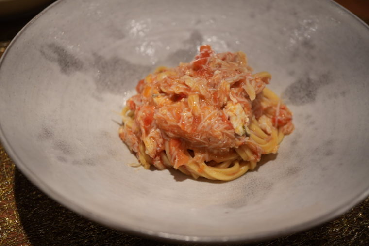 「毛蟹のタリオリーニ」は、北海道産の毛蟹とトマトだけで構成された一皿。しなやかな手打ち麺に蟹の甘みと旨味が絡みつき、蟹を食べている感覚に近い。構成のシンプルさと満足度の高さが比例している。