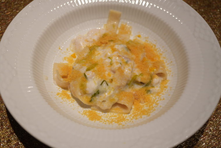 「白子とカラスミのラガーネ」は、ふぐの白子のねっとりとした甘みに、自家製カラスミの塩気。太めのラガーネの存在感が全体を支え、青ネギの香味が重さを和らげる。舌に残る旨味が長く、リズムの良さを感じる構成。