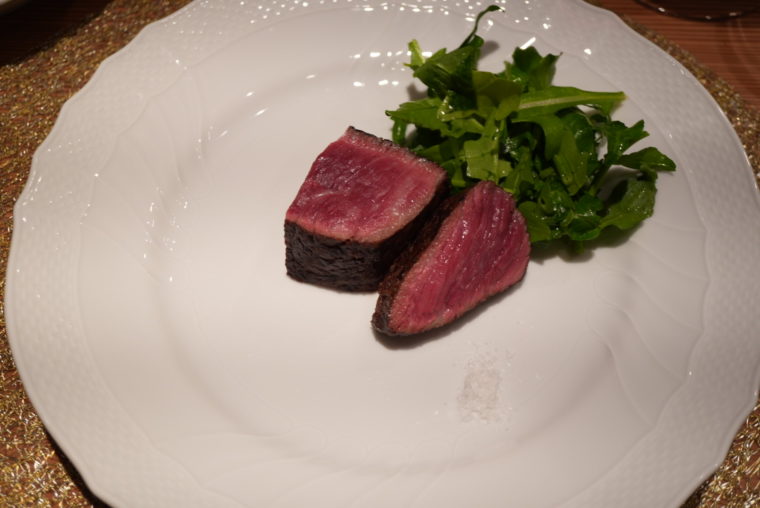 肉料理は「菊池源吾牛のミスジ炭火焼き」。脂のキレが良く、表面の香ばしさと中心部のロゼのコントラストが見事。塩だけで仕上げるシンプルな構成だが、肉の質と火入れで十分成立する。付け合わせはルッコラセルバチコとクレソン。野菜の苦味が肉の甘みを引き立てる。