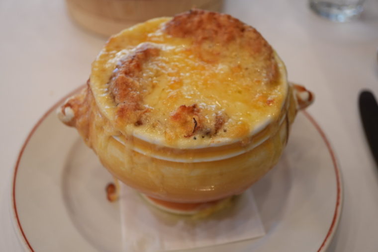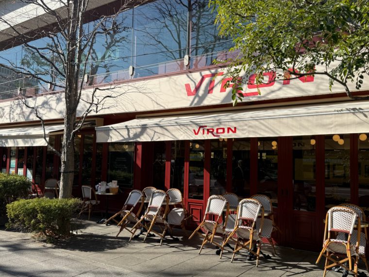2026.01.13 昼 この料理、パンと出会うために生まれたのか。@ブラッスリー・ヴィロン 丸の内店 パン・サンドイッチ・ハンバーガー 東京・日本橋 3000円〜4999円 ★★★★☆ 東京・丸の内。整然としたオフィス街の並木通りに、ひときわ目を引く赤いファサード。通りに面したガラス越しに、籐の椅子がずらりと並び、白いオーニングには赤字で「VIRON」のロゴ。まるでパリの街角をそのまま運んできたような佇まいに、足が止まる。見た目はオシャレなカフェ、出自はパン屋。だがここをただのブーランジュリーの延長と思うなかれ。『ブラッスリー・ヴィロン 丸の内店』は、バゲットの実力で都内屈指の人気を誇るヴィロンが仕掛けた、“パンを食べさせるためのレストラン”。 パン屋が本気で皿を使い始めたらどうなるか? ランチタイムは11時半スタート。だが人気ゆえ、予約がなければ11時に名簿に名前を書くところから始まる。メニューは選べるメインに看板のバゲット付き。システムだけ見れば普通のランチ。でも、ここは“バゲットのための献立”が組まれている、ユニークなレストランだ。パリの街角を思わせるテラス席なら、アラカルトも、ブーランジュリー併設のパンもつまめる。そこもまたパン中心主義の表れ。 まず出てきた「オニオングラタンスープ」で早くも主従が逆転。とろけるチーズに包まれたバゲットが、スープを吸ってとろっとろ。底のパン、上のチーズ、その間にオニオンの旨味が橋をかける。もはやスープというより、チーズとパンの熱々ラブレター。スプーンを入れるたび、パンの可能性が広がっていく。 そしてこの日のメイン、「鹿児島産豚ロースのロースト 赤ワインソース」。ぶ厚いロースに、しっとりとしたロゼ色の火入れ。豚の脂の甘みがじんわり溢れて、赤ワインソースのコクがそれを受け止める。グラタン・ドフィノワ風のジャガイモにはカリカリのチーズがアクセント。 そしてもちろん、全体を一つにまとめ上げるのがバゲットだ。ソースを拭う、グラタンと合わせる、肉と一緒に噛む。全部が“パンに載せたくなる味”でできている。 料理にパンが“寄り添っている”のではなく、パンに向けて料理が“寄り添っている”ように感じた。そう思わせるような構成が、皿の上にいくつも重なっていた。パン屋が料理をつくるとこうなるのか、という驚きと、納得。これはただのパン付きランチじゃない。パンの旨さを中心に据えて食事を楽しむという、一つの完成されたスタイル。ご馳走様でした。 — ブラッスリー・ヴィロン 丸の内店050-5596-5875東京都千代田区丸の内2-7-3 東京ビルTOKIA 1Fhttps://tabelog.com/tokyo/A1302/A130201/13020161/