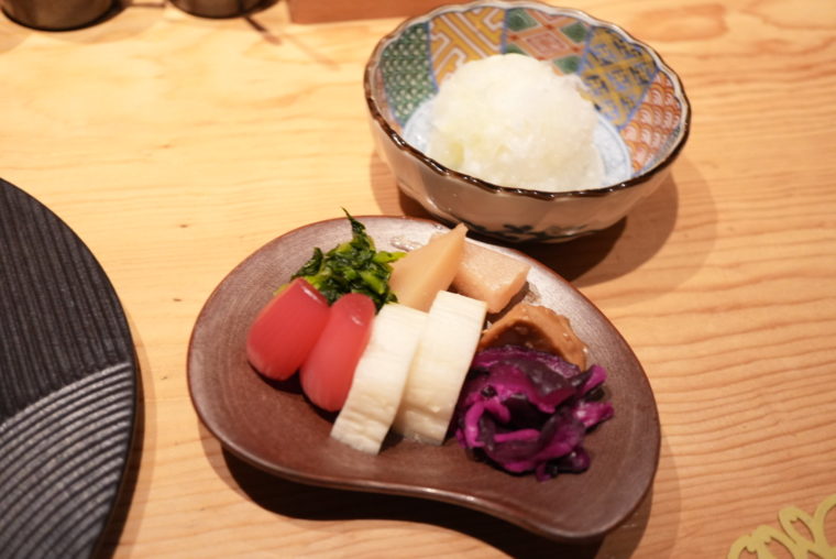 「金沢のお漬物盛り合わせ」「大根おろし 酢醤油」箸休めとして機能